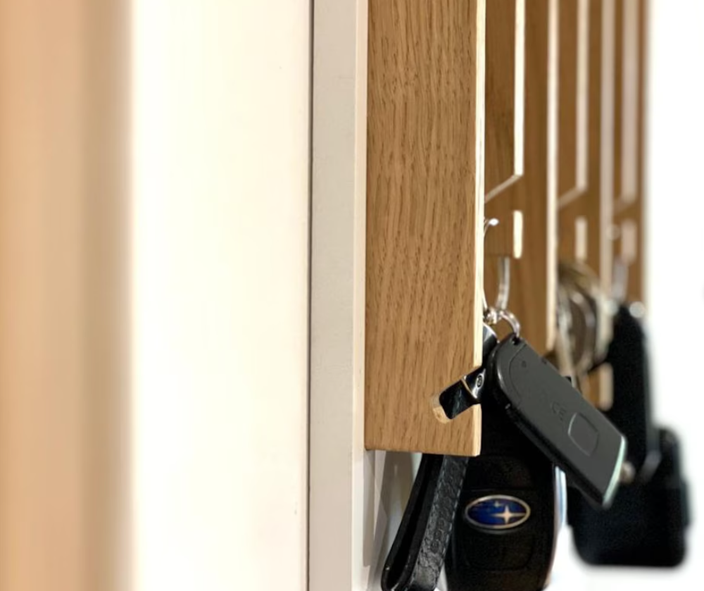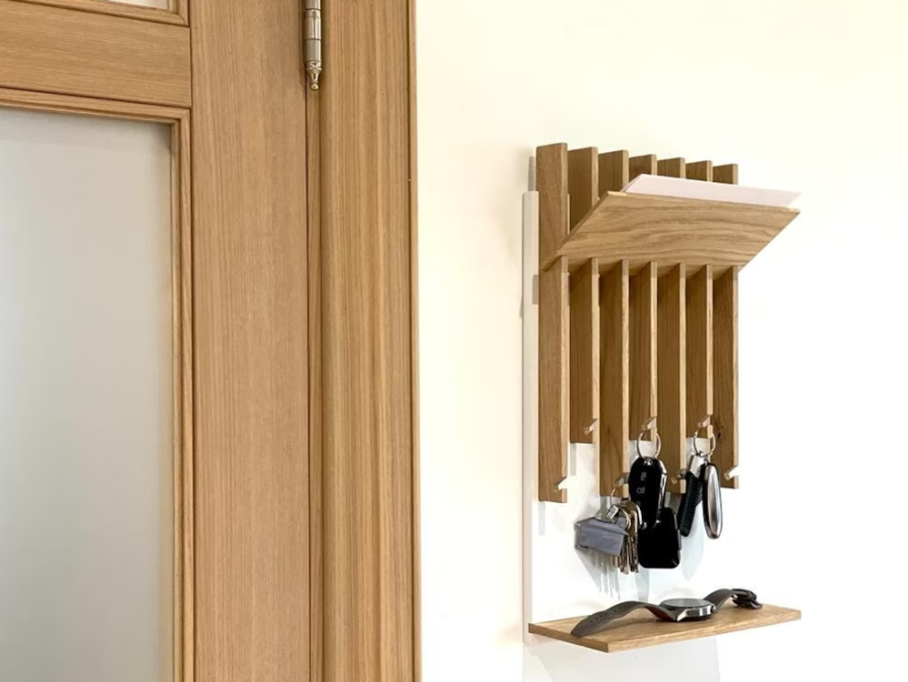 • DESIGN FEATURES: Wall-mounted key holder crafted from natural oak with a sleek, modern design featuring vertical slats and multiple hooks for organised storage