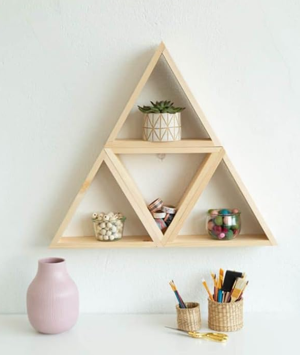 DESIGN: Trendy triangle-shaped floating wall shelf crafted from natural wood, featuring 4 geometric compartments for stylish storage and display