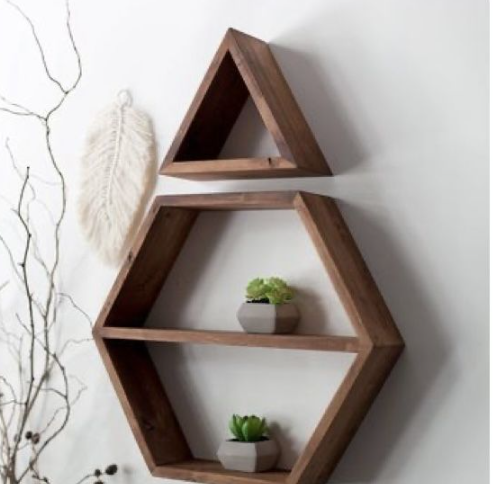 Geometric Wall Shelf Set, Triangle and Hexagon, Wooden, Rustic Brown, Modern Floating Display Shelves | Dhan Decor by JKS