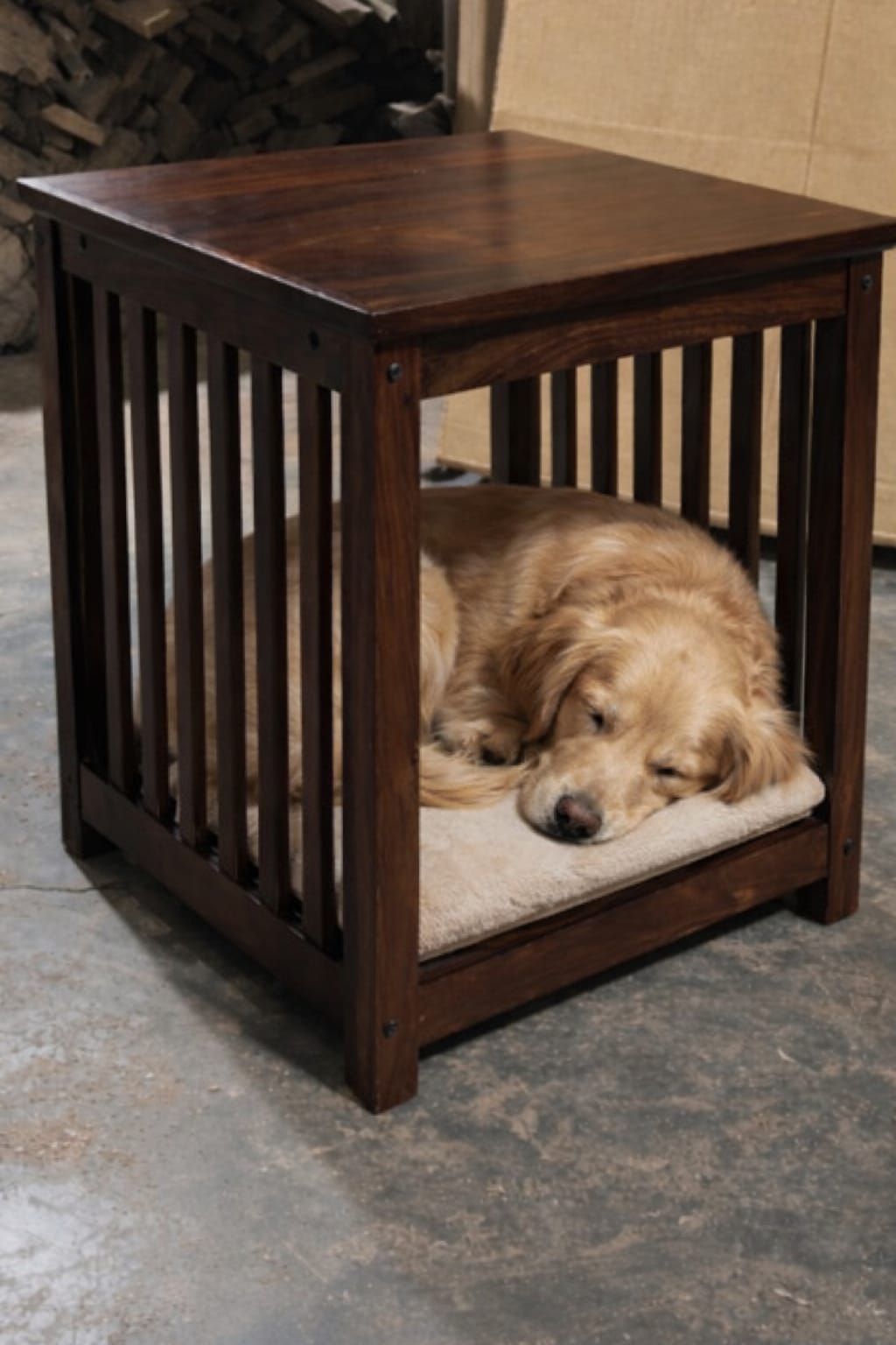 This stylish and durable wooden pet crate provides a cozy and secure space for your pet to rest. Crafted from high-quality dark walnut wood, it features vertical slats for ventilation and an easy-to-clean cushioned bedding for comfort. Ideal for indoor use, this pet crate doubles as a functional side table while offering a safe and comfortable environment for your dog to sleep or relax.